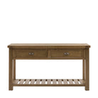 This versatile console table combines timeless design with everyday practicality. Featuring two spacious drawers with classic metal handles and a practical slatted lower shelf, this console table offers ample storage and display opportunities, perfect for hallways, living spaces, home offices and more. The warm wood finish made with oak solids & veneers highlights natural grain, creating an inviting focal point for any home.