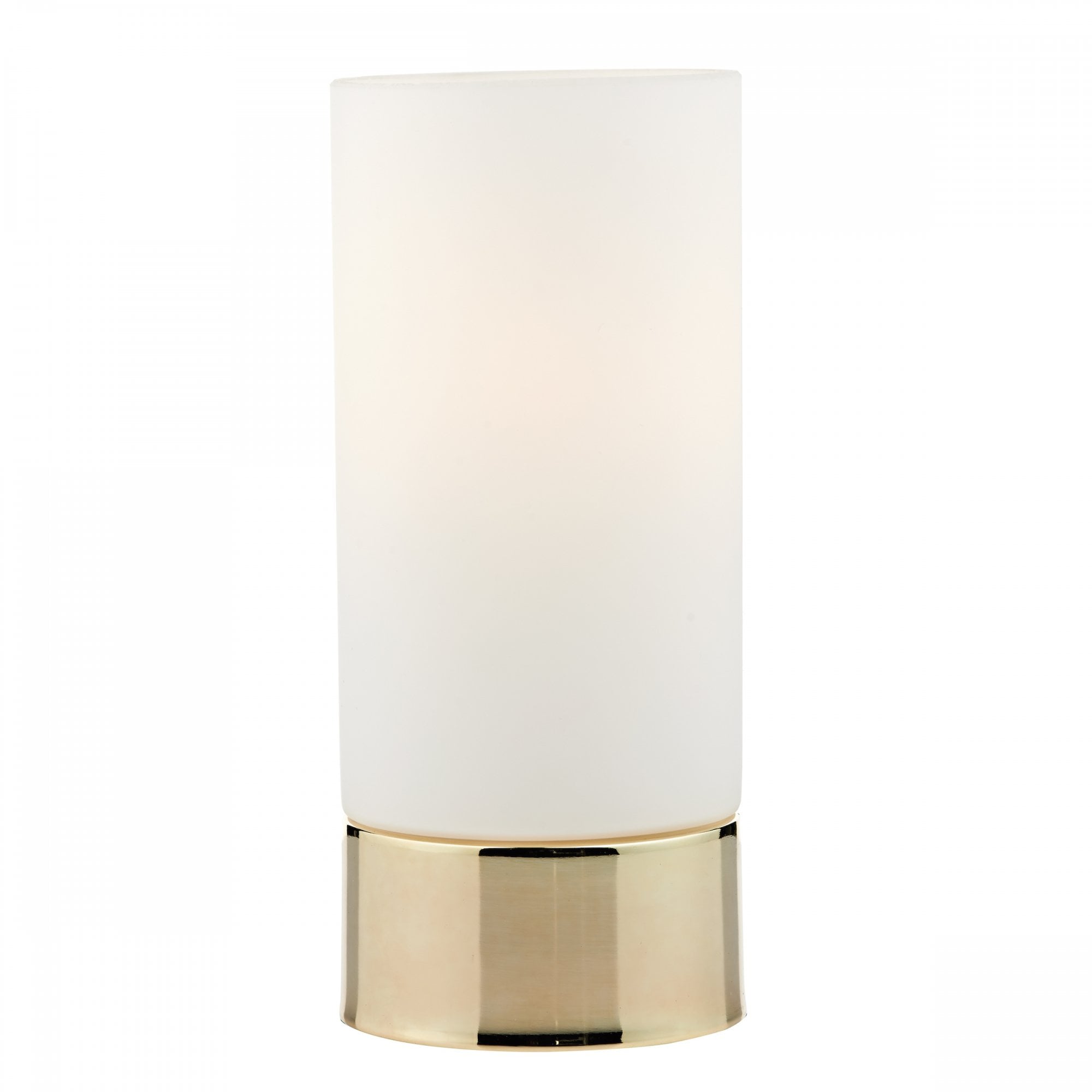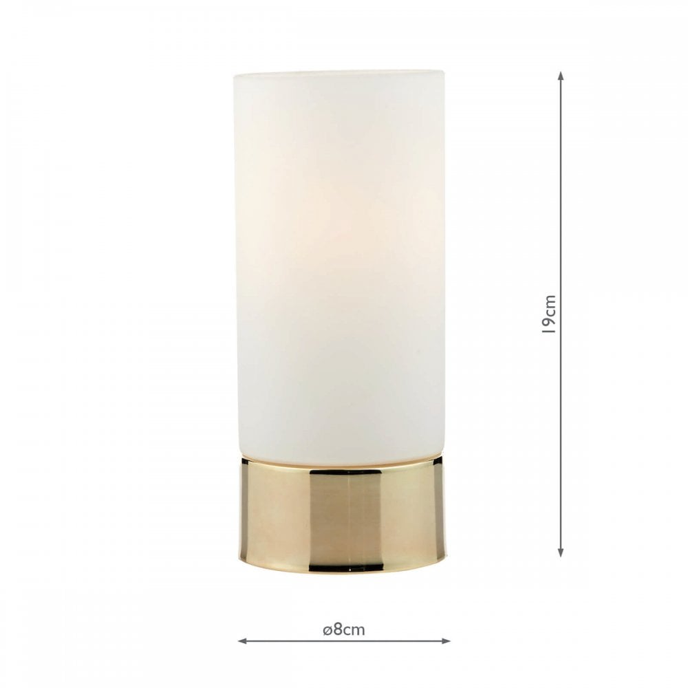 The Jot Touch Table Lamp features a cylindrical opal glass shade resting on a polished gold base. It's 3 stage touch operated, which makes it perfect as an occasional table lamp where space is limited.