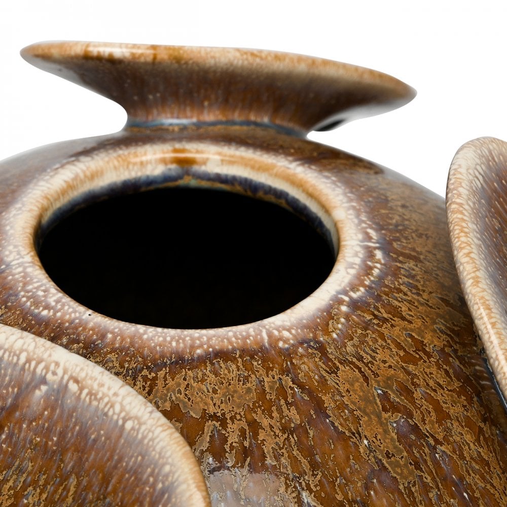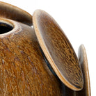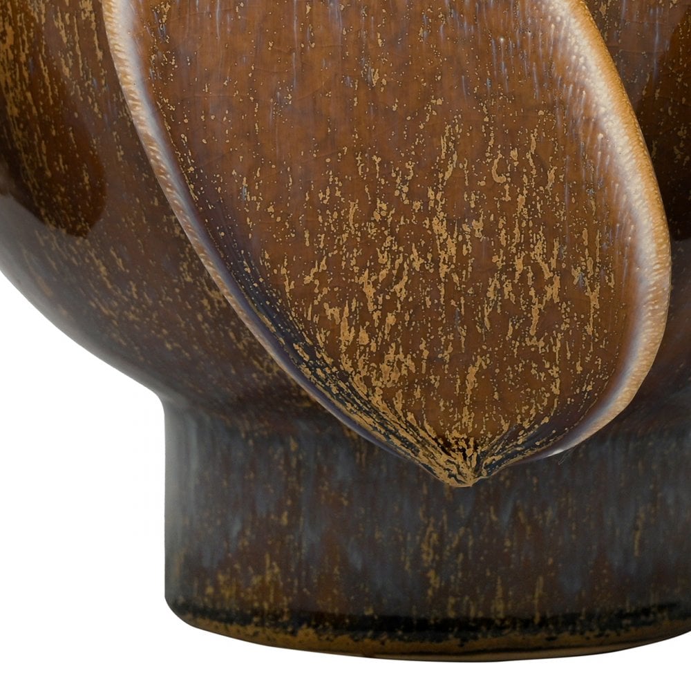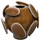Striking and sculptural, the Medway Reactive Glaze Round Vase is a standout piece designed to bring form and texture to interior spaces. Perched on a narrow base, its orb-like silhouette is finished in a glossy, layered reactive glaze in warm brown tones, offering rich depth and tonal variation. Oversized raised discs punctuate the surface, casting soft shadows and creating a sense of movement across the rounded form. Style it as a singular statement or pair it with the matching Medway Reactive Glaze Planter to create a cohesive, textural display.