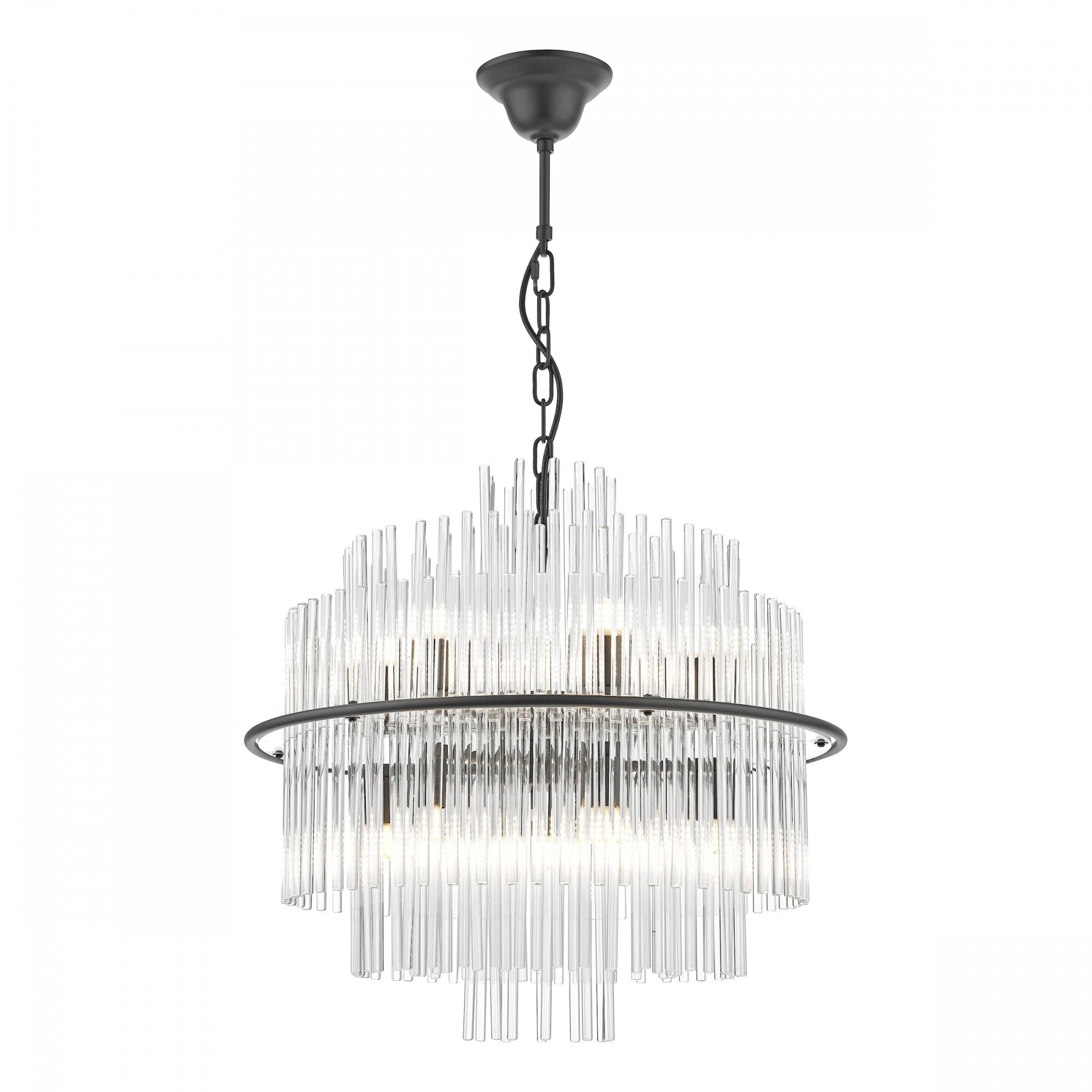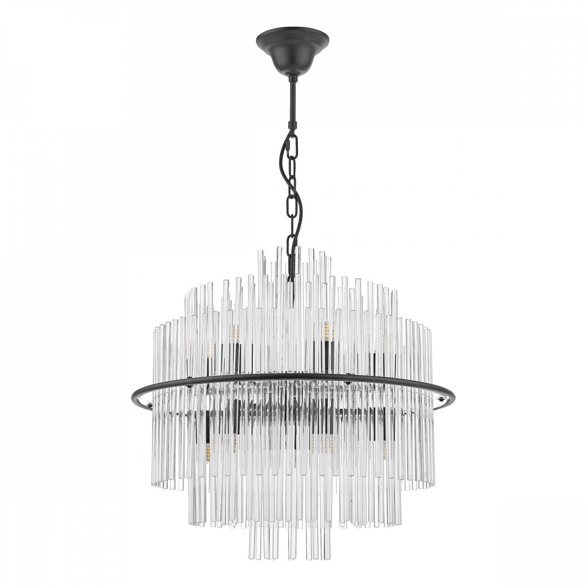 The Lukas 13 Light Pendant, a dazzling masterpiece crafted with hundreds of tiered glass rods, creating a captivating floating illusion within a satin black band. The height-adjustable design allows for customization, making it the ideal statement piece for any living area.