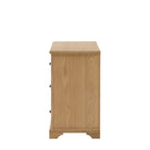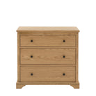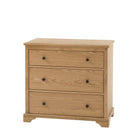 Discover practical elegance with this charming light wood chest of drawers. Crafted with premium solid oak and veneers with a warm natural finish, the chest showcase the natural beauty and grain of wood. The contrasting dark knobs add a classic touch, making this chest a timeless and functional addition to your bedroom, perfect for both traditional and contemporary room schemes. Featuring three spacious drawers providing ample storage.
