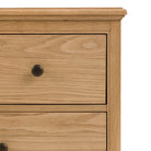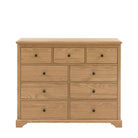 Maximise your storage with this expansive wooden chest of drawers. Featuring a versatile mix of nine drawers, including three smaller top drawers, this chest offers extensive organisation and storage alongside elegant style and premium quality. The warm, natural wood finish crafted from high quality oak solids and veneers is full of rich grain detail, beautifully complementing a wide range of interior styles. The classic dark knobs finish off the chest perfectly, combining timeless appeal with incredible practicality for any room.