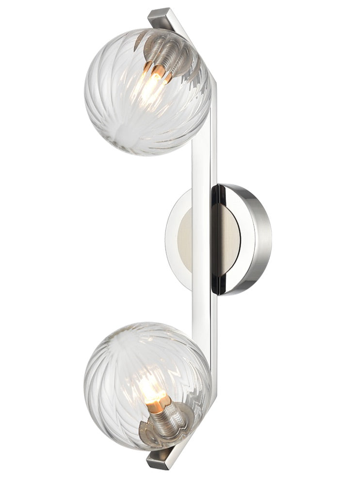 Satin nickel and chrome finish wall light with clear ribbed glass spheres.