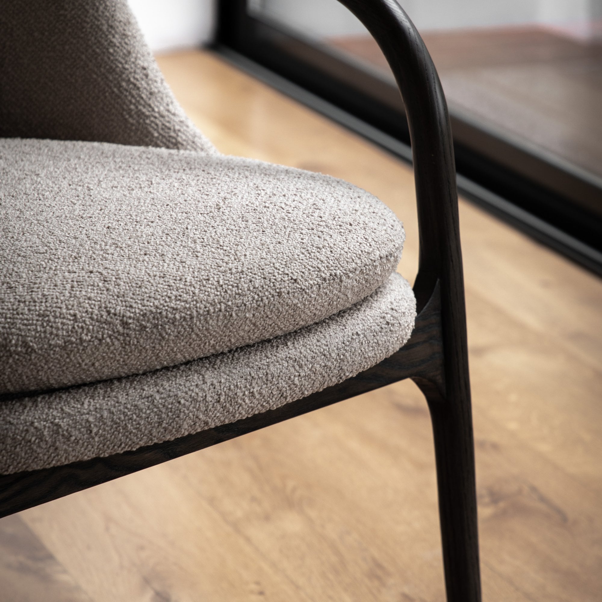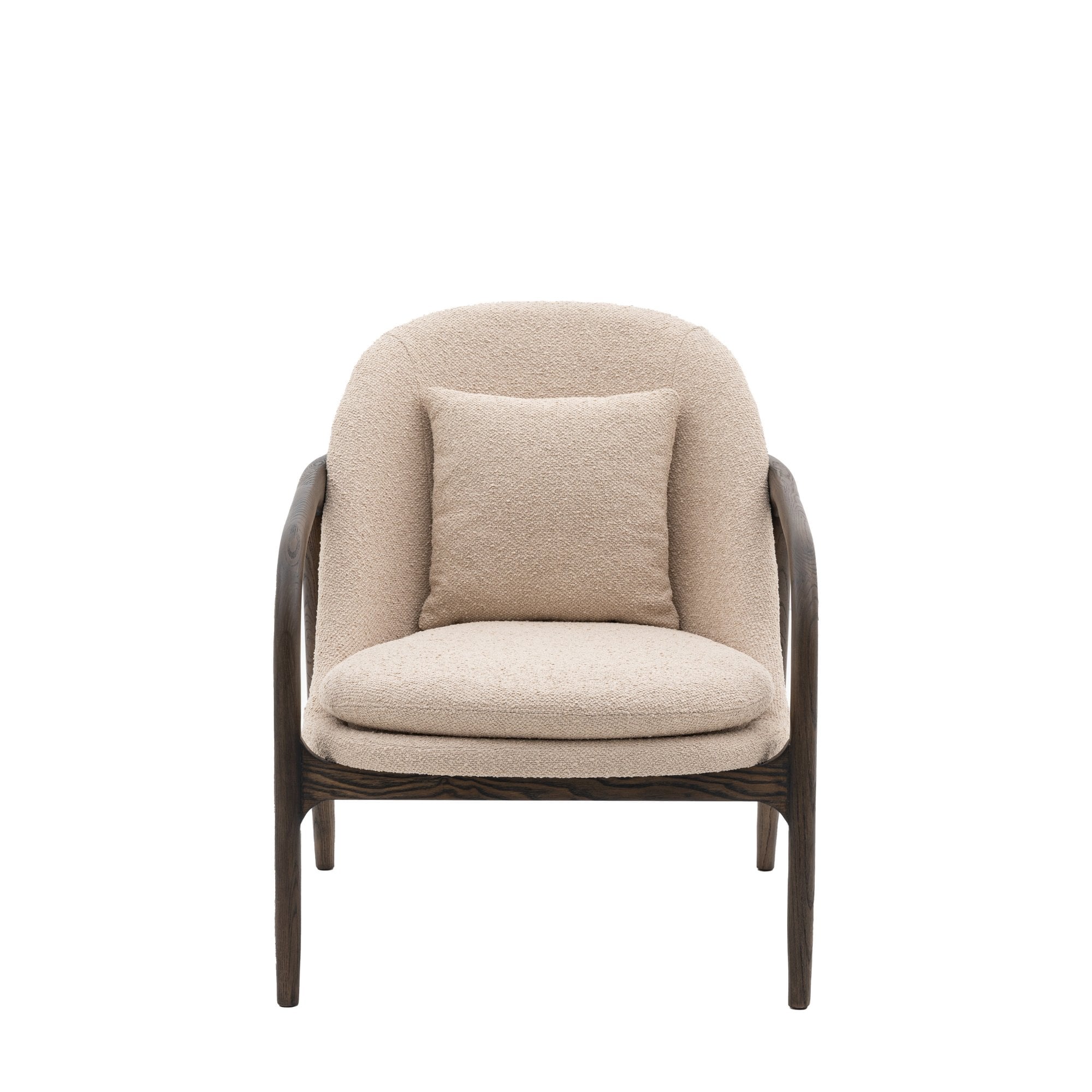 Stylish and quirky Mid-Century inspired chair with hand curved sleek lines. The dark wood frame curves around the seat creating soft and sleek lines that are perfect for both modern and vintage inspired interiors. Upholstered in retro feeling yellow ochre fabric with a padded seat cushion and comfortable back cushion.