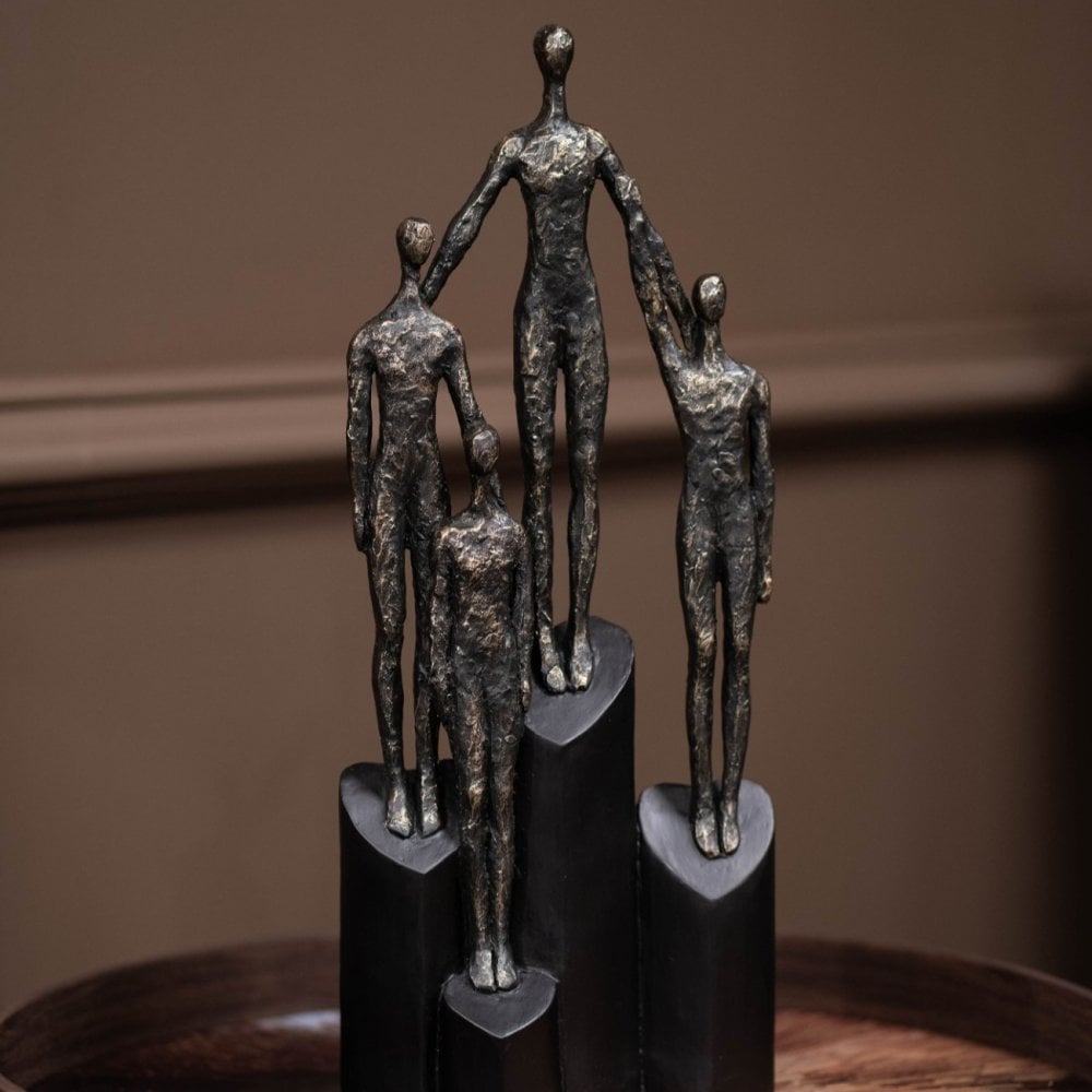 Abstract Family Sculpture on Hearts Plinth – A beautifully crafted representation of love and unity, this sculpture features a family of four, elegantly arranged on a plinth of hearts. The figures, cast in high-quality resin, stand facing forward, with the tallest member gently placing their hands on the shoulders of the others. The intricate detailing highlights the strength and bond between them, while the heart-shaped base symbolises the foundation of love and connection. This striking sculpture serves as both a captivating work of art and a powerful symbol of family, celebrating the beauty of togetherness and the warmth of shared moments.