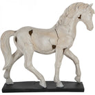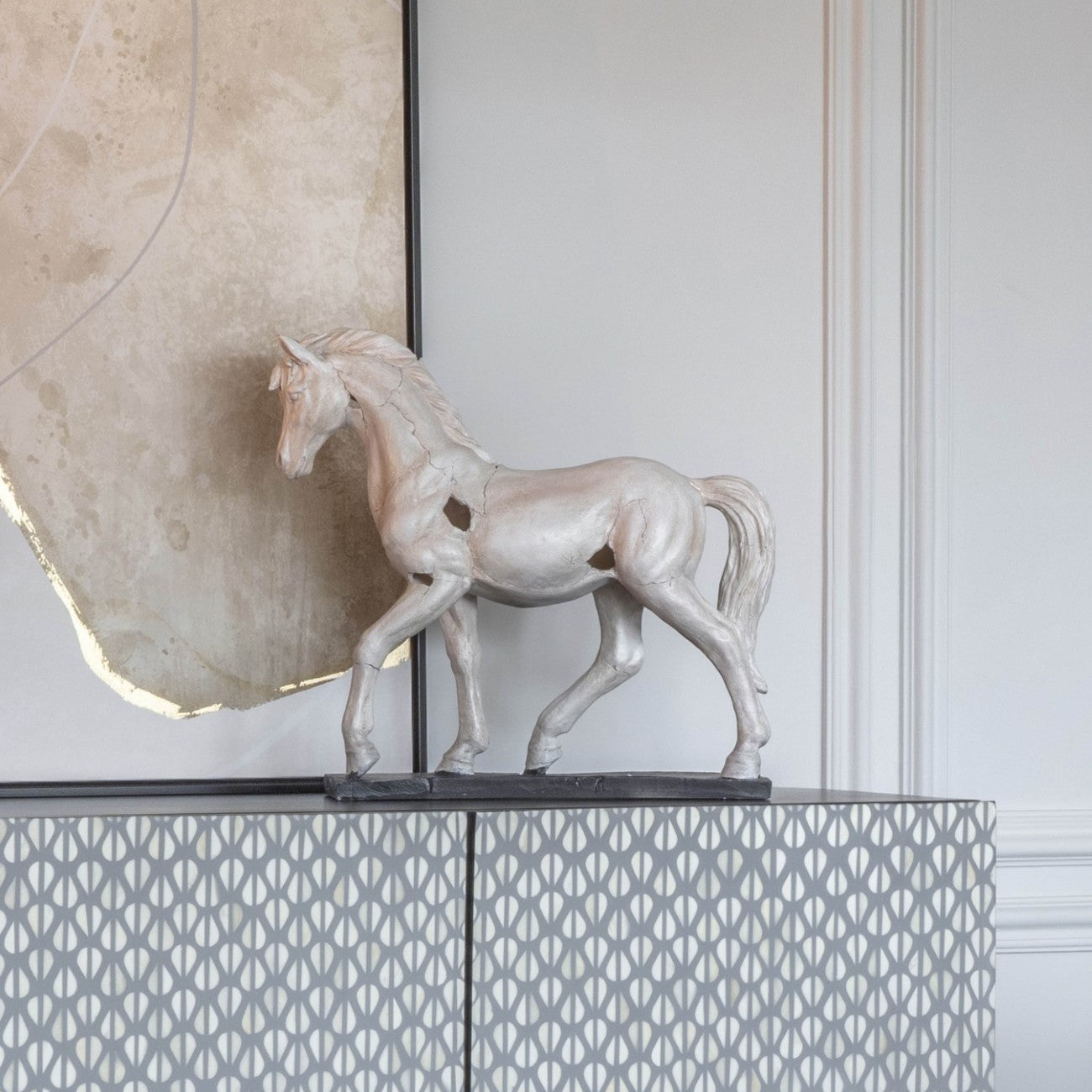 The Aged Horse Sculpture with deconstructed detailing effortlessly blends rustic charm with natural elegance. Exquisitely crafted with timeless artistry, this captivating piece features a weathered, slightly textured surface that speaks to the passage of time, while its deconstructed elements add a rich layer of history and character. The neutral, organic colours further enhance its natural appeal, allowing it to seamlessly complement a variety of interior styles. Mounted on a painted black wooden base, the sculpture is made from resin, offering the allure of a metal sculpture. Each piece is unique, with subtle surface variations ensuring no two sculptures are alike. Whether displayed in a contemporary living room or a more traditional setting, this sculpture exudes strength and grace, making a bold statement of individuality and style.