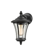 IP 44 rated external wall light in charcoal in a classic lantern style. The glass is clear, with a raindrop effect.