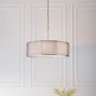 The Cordero is a classic circular light with a trendy geometric fretwork metal outer and an inner fabric shade for lovely light diffusion.