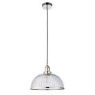 An authentic 'retro' style industrial pendant, finished in bright nickel plating with authentic knurled lamp holder details and vintage style clear ribbed glass shades.
