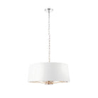 The Harvey 3 light pendant is finished in bright nickel plate and complemented by a vintage white, faux silk shade with metallic silver inner, for the perfect sophisticated boutique hotel look. Matching items also available.