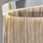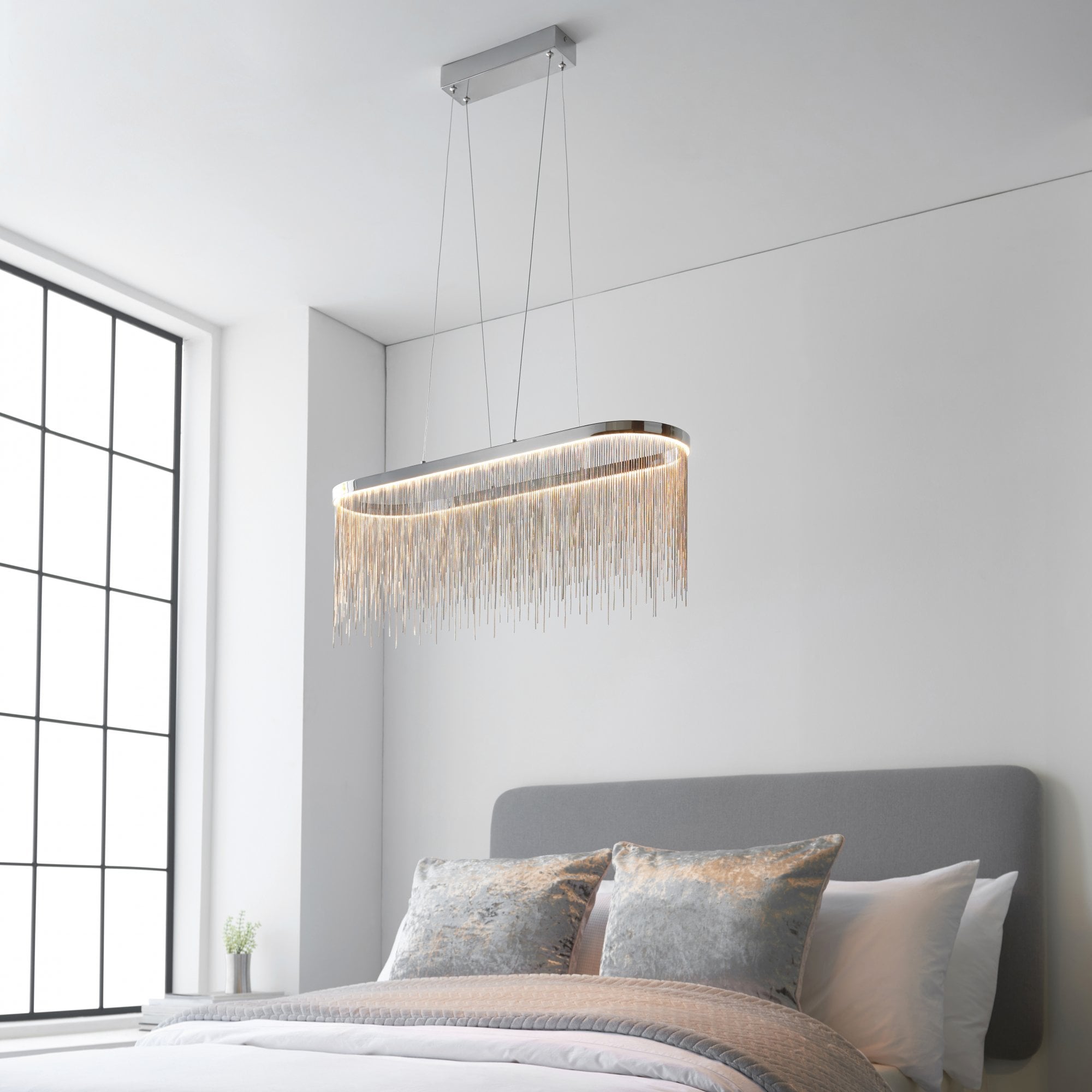 The Orphelia collection of pendants all feature a stunning waterfall of fine silver chains that give off a diffused light effect and a polished chrome finish. The height is adjustable with a 1.5 metre clear flex and is integrated with 26w LED 579 lumens 3000k warm white.