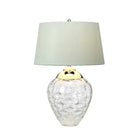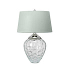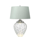 Samara's Clear textured blown glass, classic polished nickel metal-work and beautiful hand-made fabric shades combine to form an arresting and gorgeous table-lamp. Combined with a 4-way switch, this design features independent light sources for the shade and the glass. (GU10 supplied in the base). Chateau duck egg faux silk shade ref LSUK003.