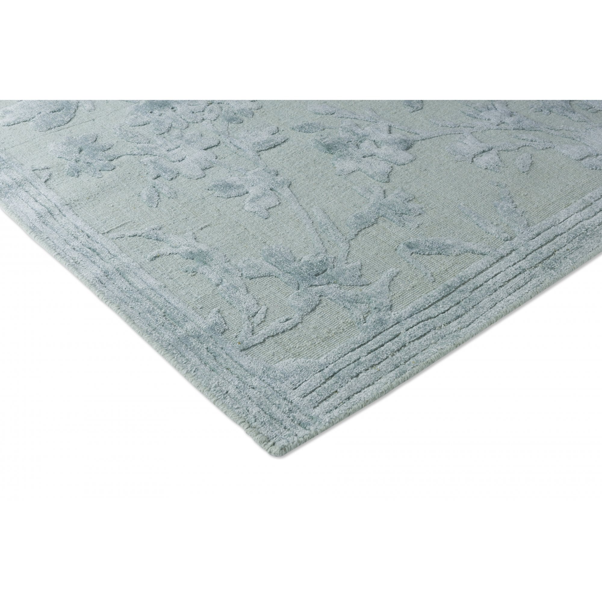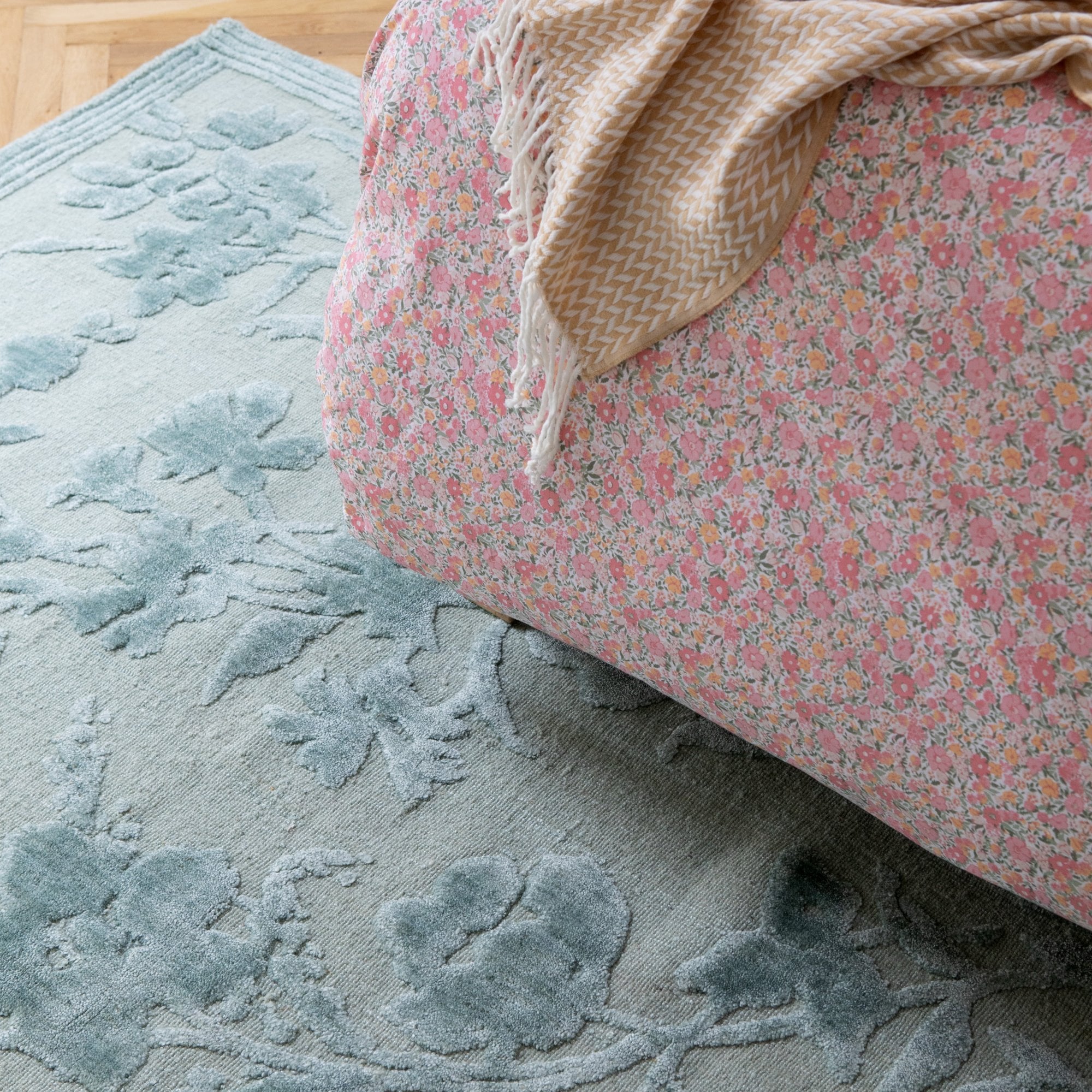 Charismatic and pretty, this striking floral monoprint is a relaunch of a wallpaper pattern held in the Laura Ashley archive, from 1996. The Rye design incorporates a trailing floral motif, featuring large flowerheads, leaves and stems. This beautiful handloom jacquard combines three qualities of yarn. The matte wool and cotton quality in the ground are the perfect base for the highlighted floral motive in the bamboo silk pile. This unique bamboo yarn gives this quality rug an element of luxury and lustre. With this a lovely antique look and feel has been created.
