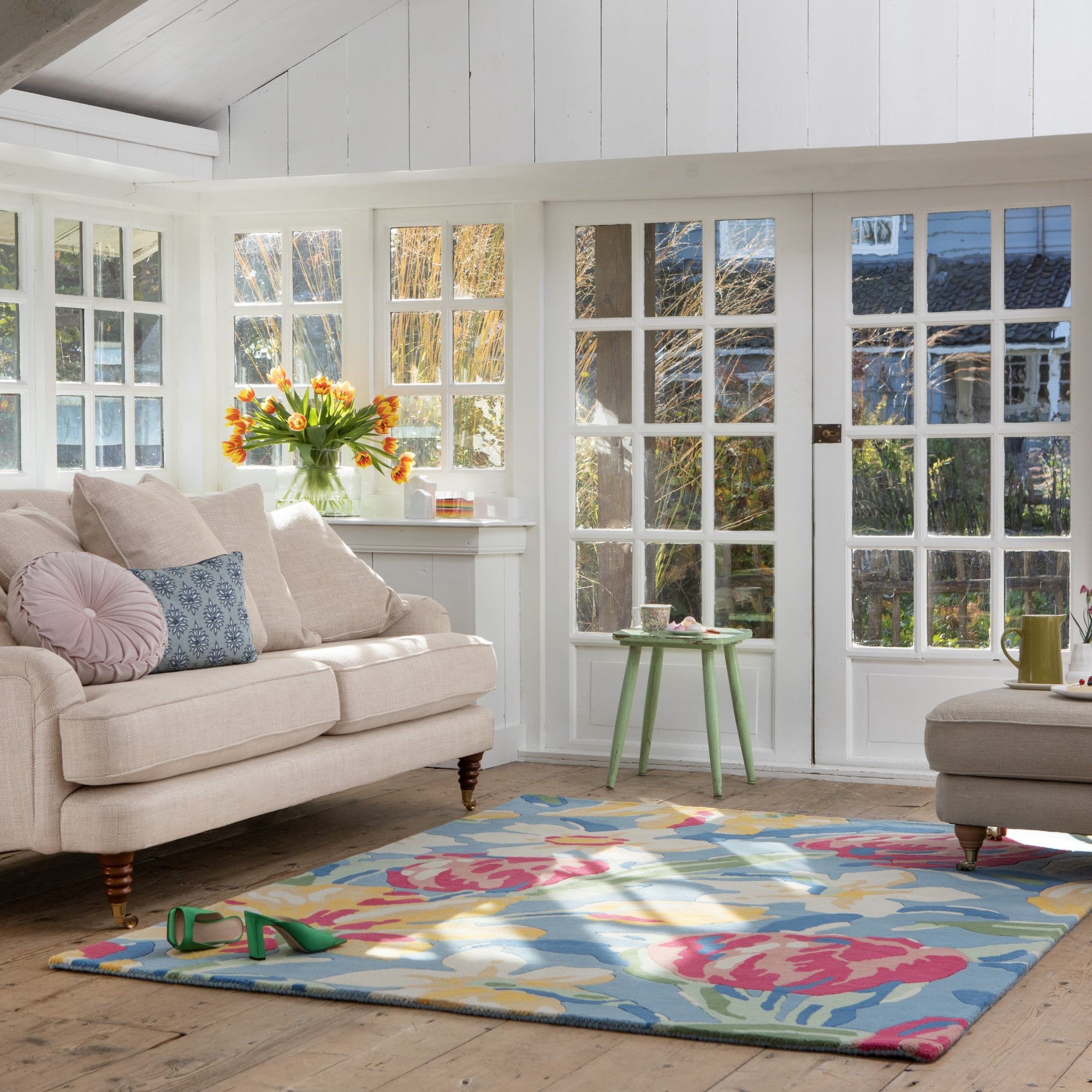 A springtime display of tulips mixed with daffodils; this 1990s gouache painted floral design was inspired by a piece of painted artwork found in the Laura Ashley archive. A bold pattern in a rich and soft hand tufted quality. Slightly carved to emphasize the bold spring flowers and to add a little extra texture to your room.
