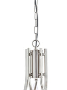 Impress your guests with this ceiling light, complete with a satin silver twist frame, clear glass sconces and 5 lights. Suspending from a sturdy chain, the 5 curved satin silver arms each point in different directions; allowing for an overall spread of illumination. The glass sconces are candle like in appearance which creates a vintage appeal. Use as a statement piece for your living room, dining room or office space.