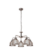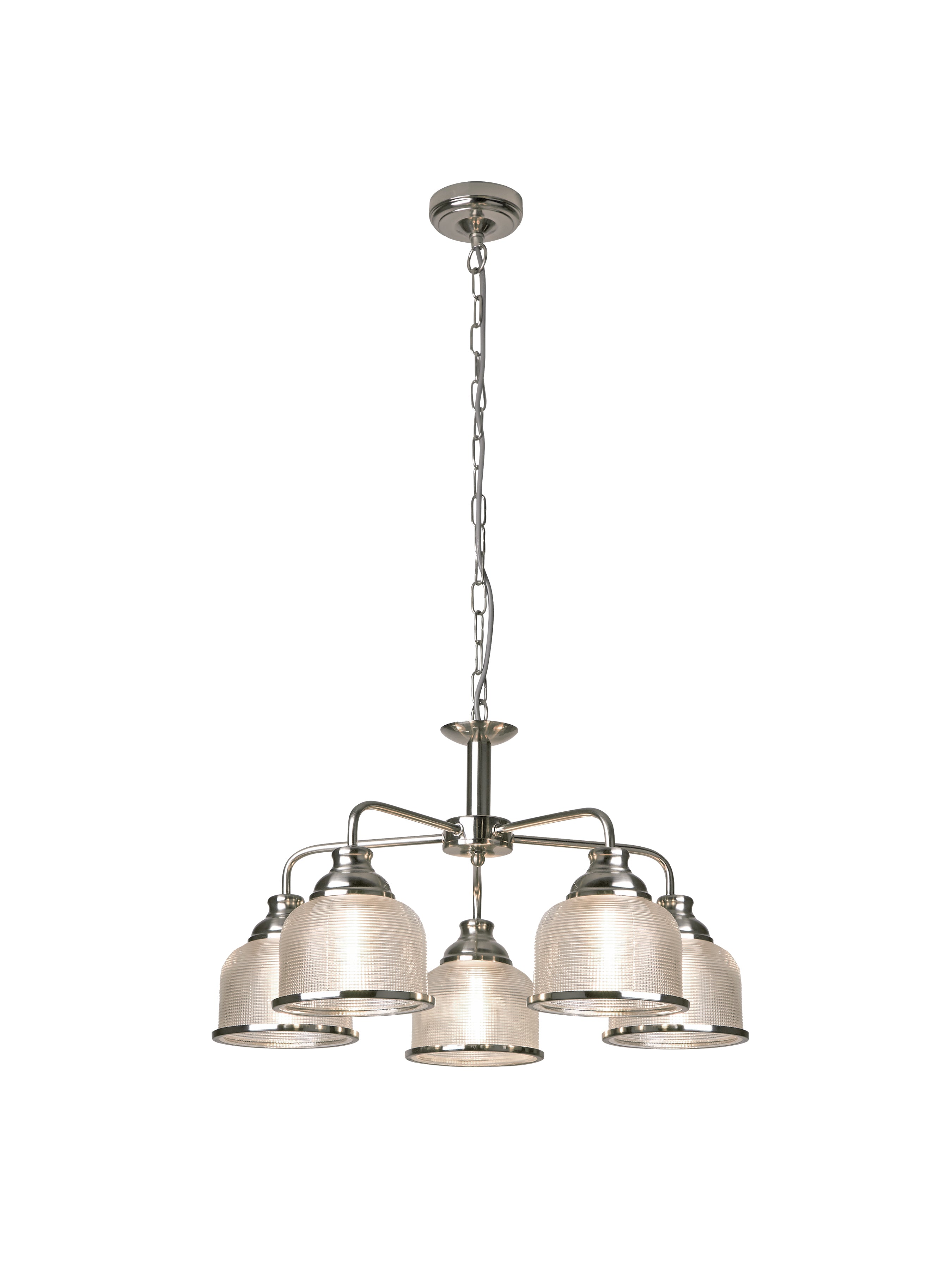 Turn heads with this attractive satin silver ceiling light. Using 5 light provides a charming warming glow perfect for brightening your kitchen or lounge. This item has a classic feel to it, with ribbed holophane glass and a satin silver trim.