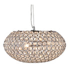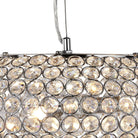 Chrome finish 3 light fitting with clear crystal buttons looks fabulous hanging from any bedroom, living room, dining room or kitchen ceiling. The elegant oval shade is made up of chrome finish rings and clear crystal buttons, which create a graceful lighting effect, and the light looks as beautiful by day as it does by night.