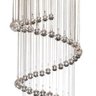 The stunning Spiral multi-drop pendant light is dressed with crystal balls forming a Spiral hanging from a circular chrome ceiling fitting. Lit by 5 lights from above and hanging 0.8 metres, the crystals appear to float in mid air and sparkle beautifully when illuminated to add an upmarket feel to any hallway or staircase.