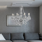 8 light chandelier with a clear glass and chrome frame has an aristocratic style, perfect for adding a theatrical touch to any large room. A traditional design with a modern twist, this ceiling light is luxuriously adorned with glass drops, curved arms and acrylic glass trimmings that creates a glamorous, picturesque focal point when illuminated