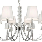 Chrome 8 Light fitting with Crystal Drops and White String Shades adds a touch of sophistication to any ceiling. The elegant chrome finish fitting has eight straight edged string shades with matching curved arms and an ornate central column, as well as chunky crystal blocks and delicate crystal drops. It has a handy adjustable chain suspension and provides a gentle source of light for the entire room.