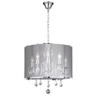 Chrome 5 Light Fitting with Silver Shade and Crystal Drops makes a stunning centrepiece for any contemporary bedroom, living room or dining room. The large silver polycarbonate drum shade gives a tantalising glimpse of the curved chrome finish arms and five candle style light fittings within. And the fitting is adorned with elegant crystal pendalogues that hang inside and just below the shade.