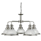 Reminiscent of the style of classic diners and bistros, the ceiling light comprises of five classic art deco shades finished in a sleek satin silver, with acid glass to provide clean lighting effects. This ceiling light brings a distinctive and elegant style to any setting, and the chain can be adjusted for different ceiling heights.