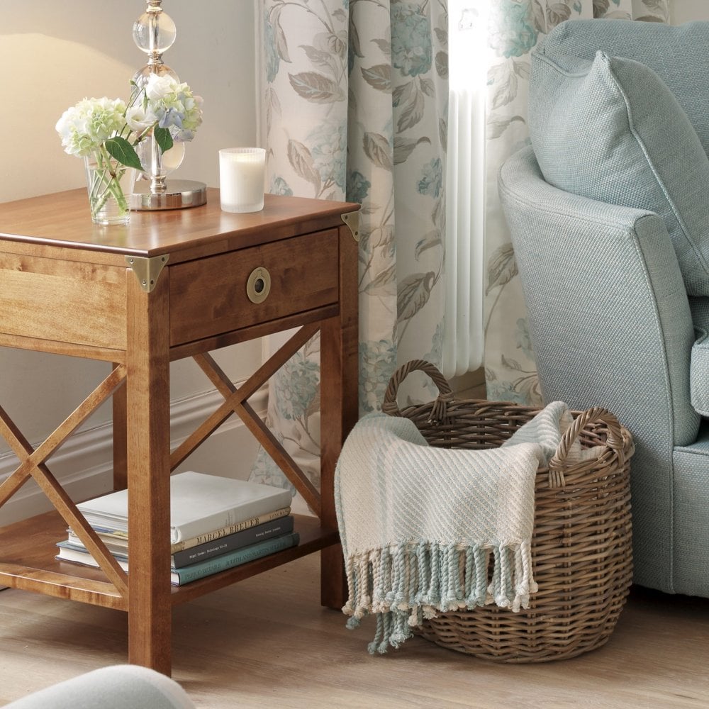 The Laura Ashley balmoral one drawer side table is as charming as it is useful. It features a single drawer and a fixed lower shelf. A combination of the antiqued brass handles and corner brackets with the hand applied patina look gives it a warm and elegant finish.