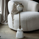Bensen is a sleek side table which combines a circular brushed brass top with a solid white marble base for the perfect balance of elegance and functionality. The slender brass stem adds a modern touch, while the natural base brings stability and unique character to each piece. Ideal beside a sofa or chair it is the perfect accent for placing drinks, books, or decorative items.
