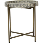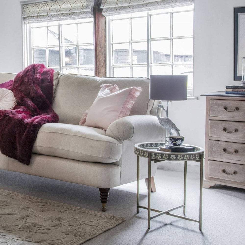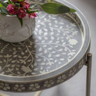 The Espley Bone Inlay Side Table features Laura Ashley’s iconic Roseate design hand crafted using tiny segments of bone each hand cut and placed into position before being bonded to the table surface using a resin compound. This The technique is an ancient Indian tradition and the bone is a bi-product of the food industry. Every segment has its own unique colour and natural variations in compound colour should also be expected. Each product is finished with solid iron legs in an antique brass finish and each top is removeable from its legs. Laura Ashley’s Bone Inlay Occasional Furniture Collection incorporates a side table with drawer, a side table and a coffee table.