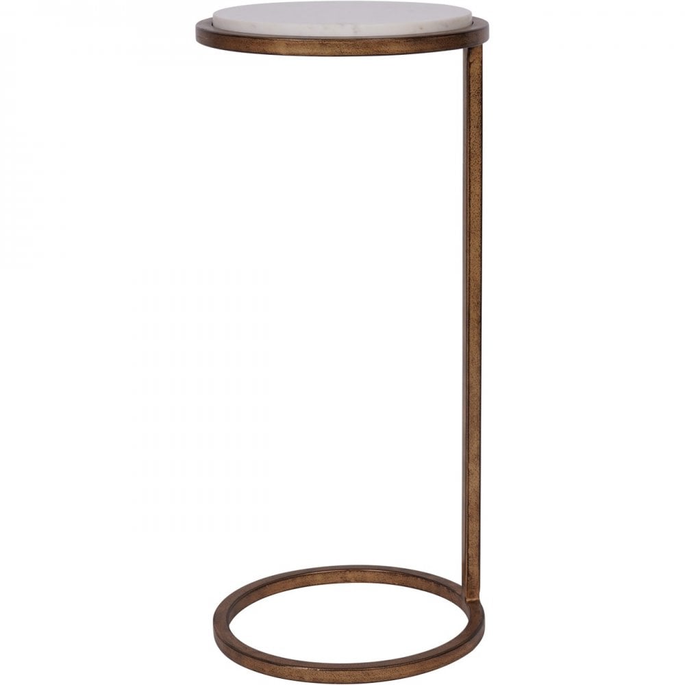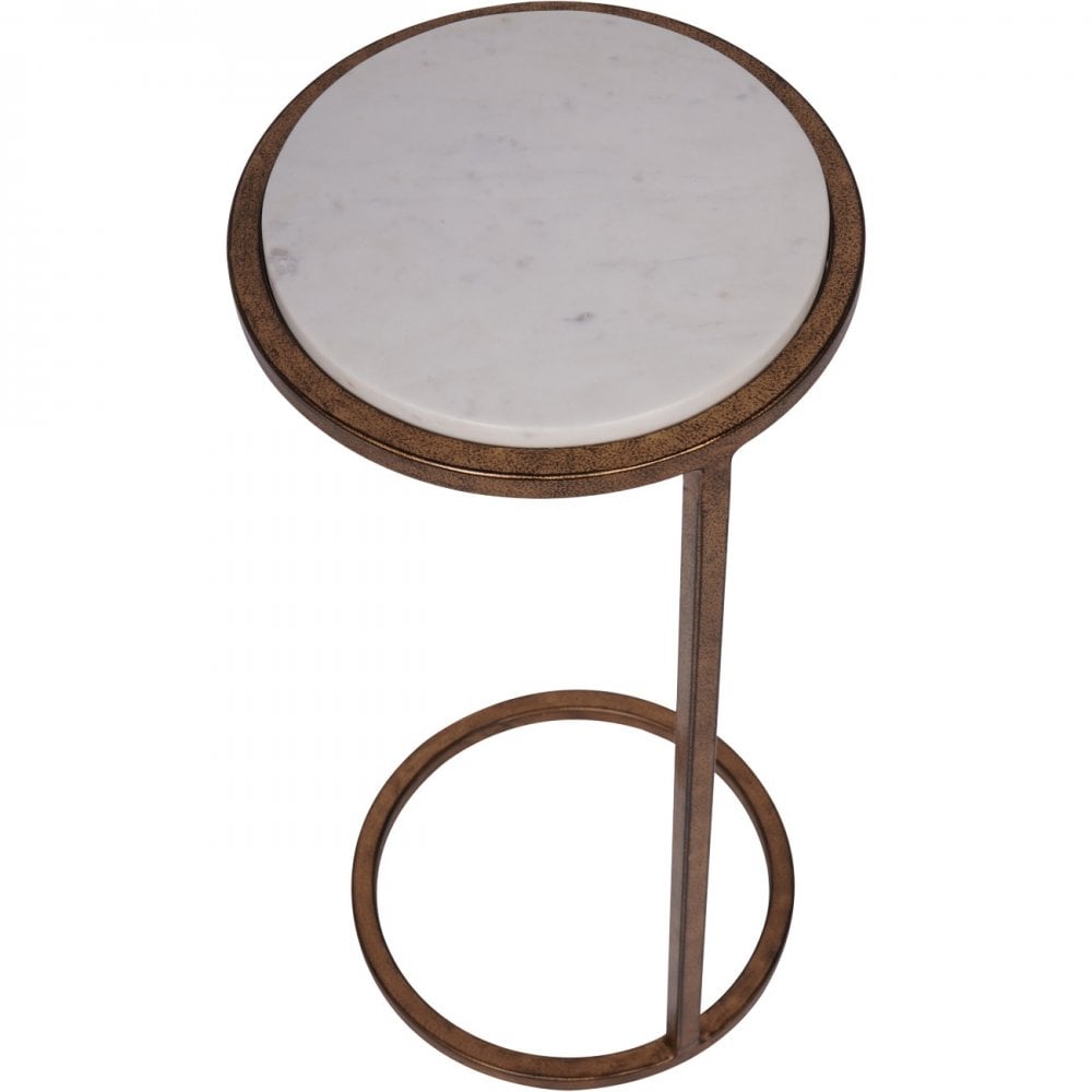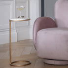 The Iota Side Table in White Banswara with a brushed metal finish in smoked gold is a is a stylish and stable piece of occasional furniture. The elegant table features a stunning White Banswara marble top, known for its bright, pure white tones and subtle grey veining, with intricate natural veining, each piece unique as this is a natural product. This marble top is complemented by a sleek, brushed metal base, giving the table a contemporary and polished look.