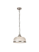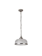 A sturdy chain sits on top of the textured ribbed effect glass shade which is complete with a satin silver trim. Light shines through the holophane glass and emits a warm subdued glow.