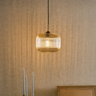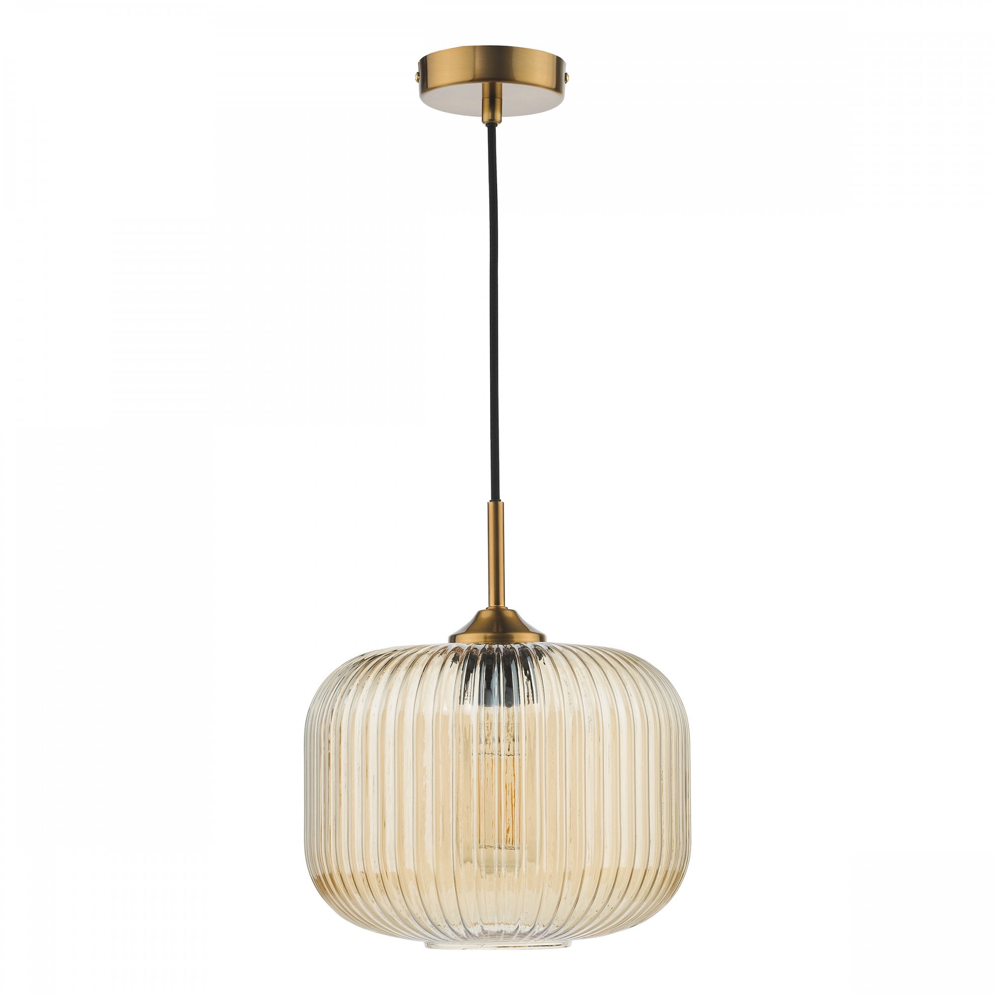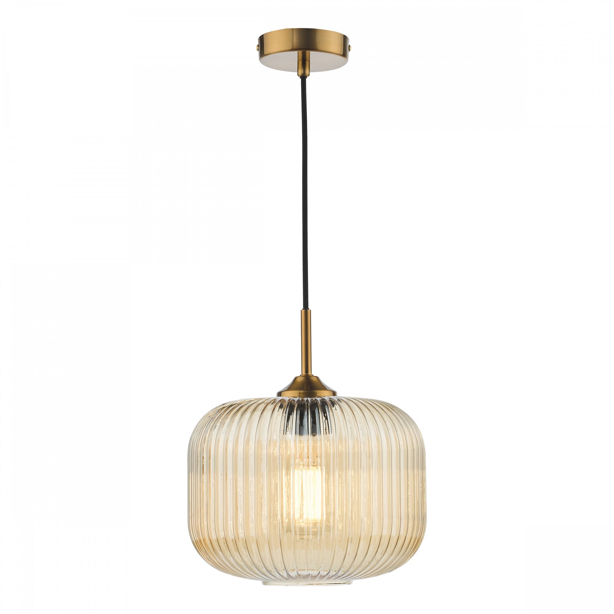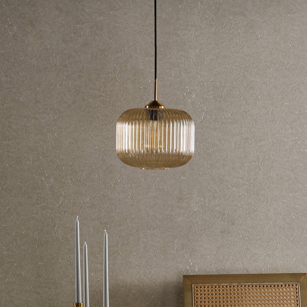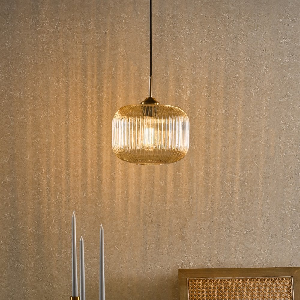 The Demarius Amber Glass and Natural Brass Pendant from Dar lighting offers a lovely amber glow. Featuring ribbed glass with natural brass metalwork and black braided cable, it offers adjustable height installation for directed lighting where you need it. Whether you fancy mood lighting for a dinner party or want accent lighting for your hallway or bedroom, the Demarius glass pendant delivers subtly sophisticated illumination with ease.