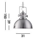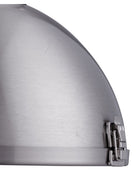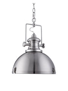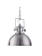 This Satin Silver Industrial Pendant Light with Acrylic Diffuser has a solid industrial style with a sleek satin silver finish. The dome shade has stylish, chunky metal features around its rim and its top, with a metal chain attaching it to the ceiling. It looks fantastic in any post-modern living space, and the clear acrylic diffuser creates a nice lighting effect for the entire room.