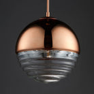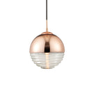 A simple yet effective copper and clear ribbed spherical ceiling pendant. Adjustable drop, suitable for use with LED lamps and dimmable. Other colour options available.