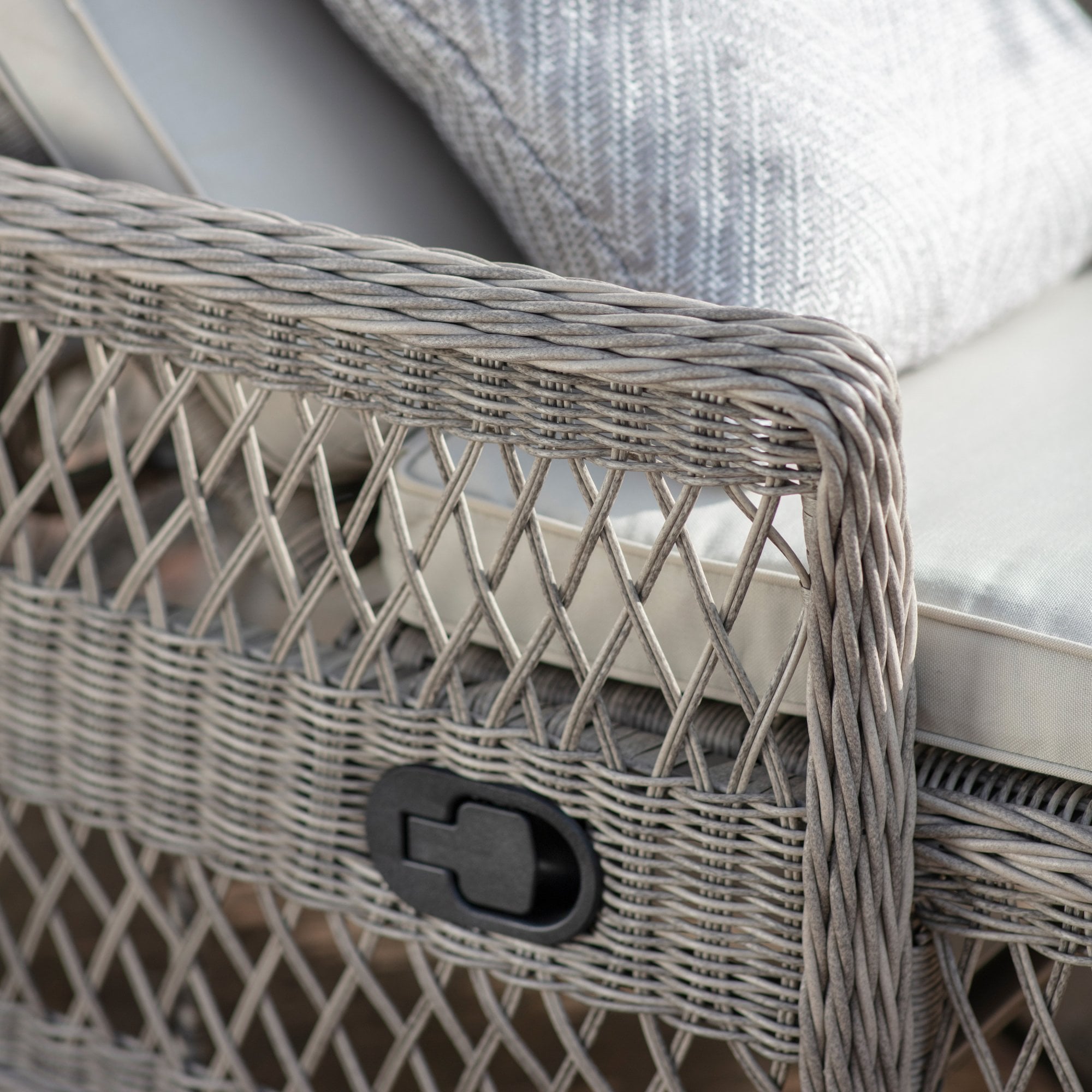 This beautiful Lounger is crafted from hand woven all weather 5mm PE rattan with a combination of close weave and open weave patterns to give a stylish design in a lovely stone colour. For comfort, the back of the lounger reclines and it has a luxurious showerproof seat and back cushion in a soft colour to complement the colour of the rattan. The frame is powder coated aluminium. A matching dining set and sofa Dining/Tea Set are also available.