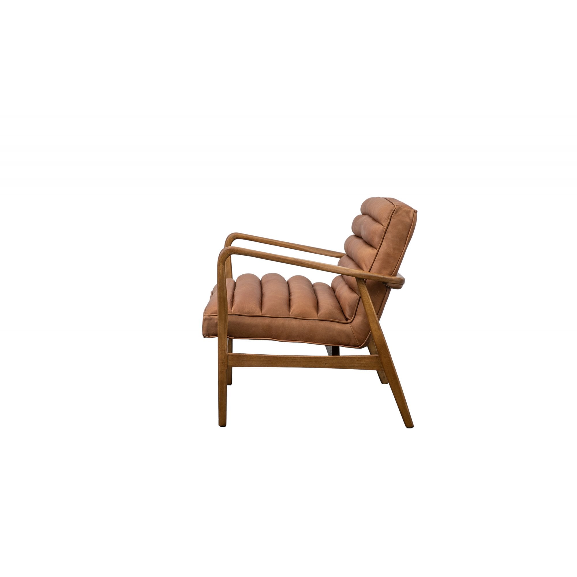 Stylish mid-century 2 seater sofa in Vintage Brown top grade leather depicting natural textures and grains, decorative horizontal channel stitched detailing and a solid oak angled frame.