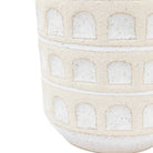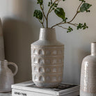 With a handmade feel, this vase will add a modern, artisanal touch to any room. The soft white glaze contrasts with the matt ceramic textured finish and the hand carved pattern to create an eye catching addition to any interior.