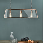 The Academy 3 Light Bar Pendant is an oversized hanging bar pendant in an antique copper finish, perfect for displaying our vintage filament lamps. A modern, industrial style fitting that could be the statement piece above a kitchen workspace.