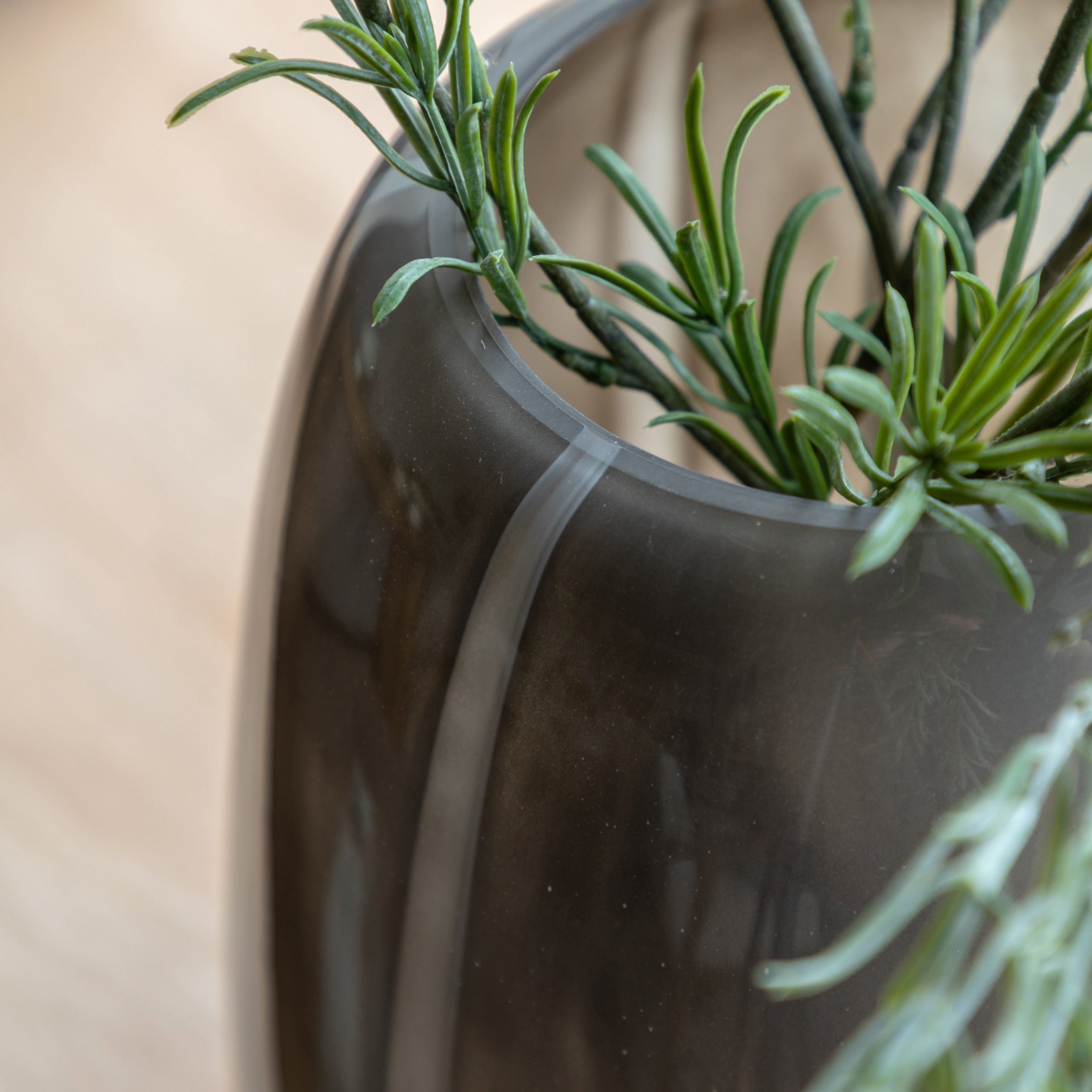 Handblown in smooth taupe glass with contrasting strip detail, this unique vase is a striking addition to any room.