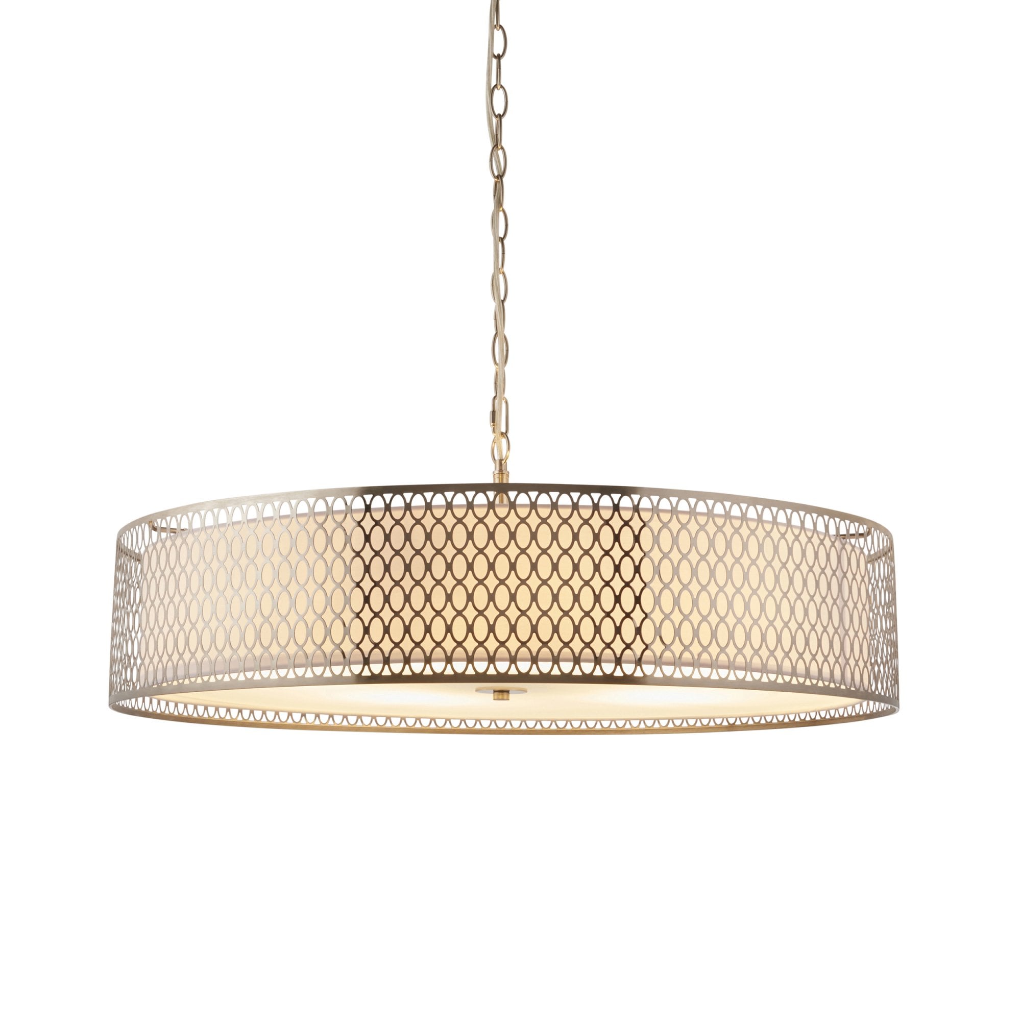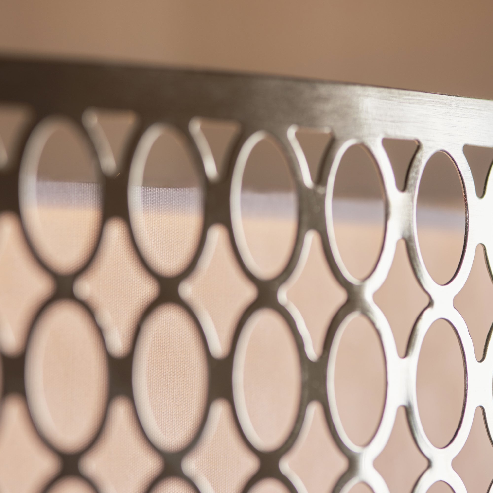 An impressive classic circular pendant with an elegant geometric metal fretwork outer, finished in satin nickel with an inner fabric shade for lovely light diffusion, complete with a frosted glass diffuser to complete the look. Matching items available.