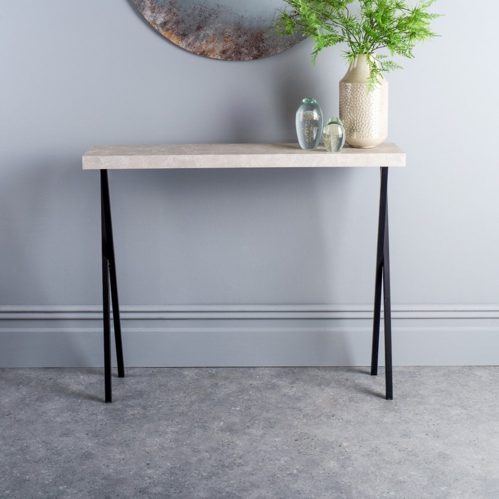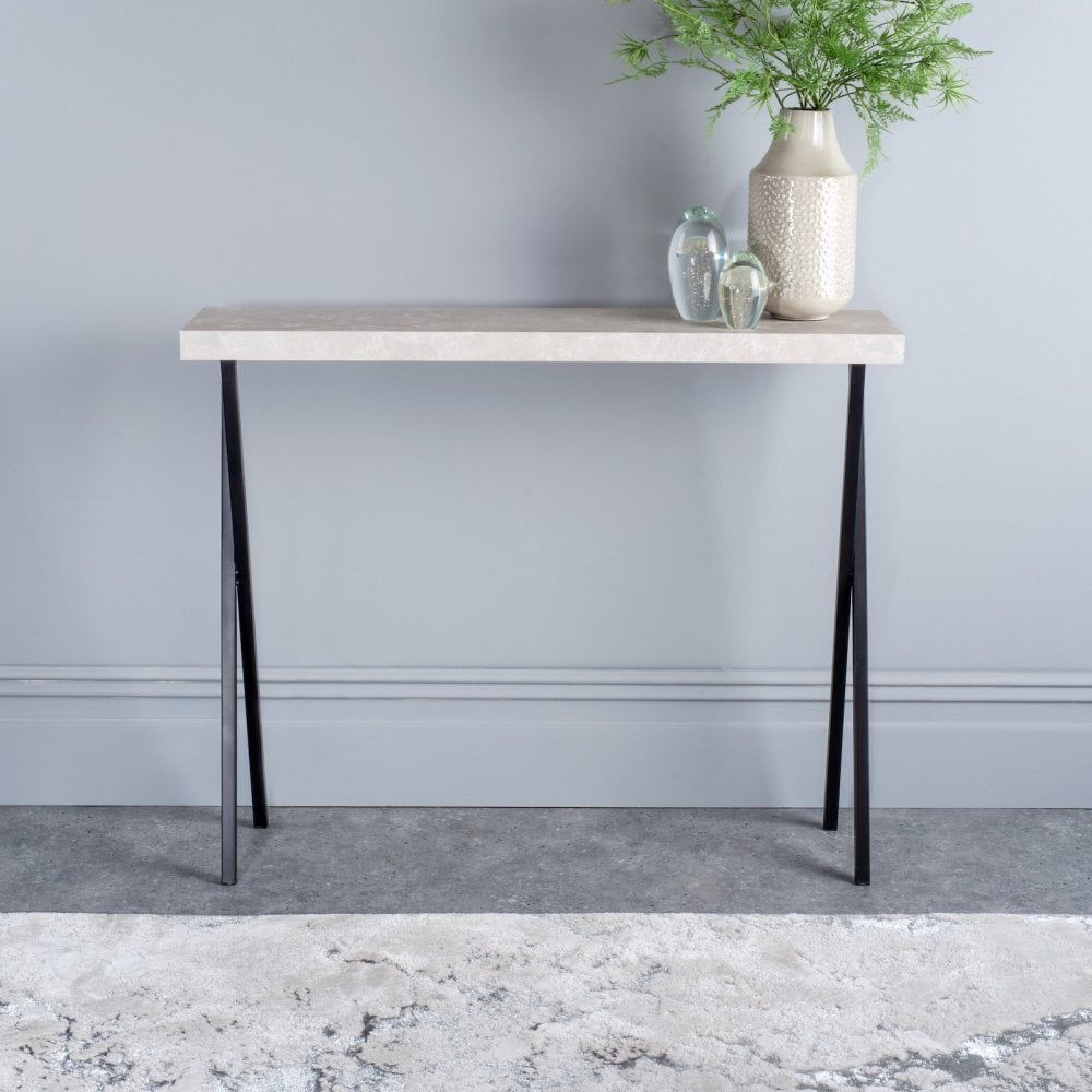 The versatile DATA console table is ideal for small rooms and hallways thanks to its narrow depth. Featuring a light grey marble effect finish with black metal legs.