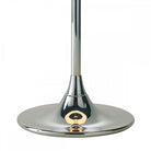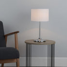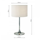 The Delta table lamp has an elegant retro inspired tear organic base in polished chrome. Comes complete with a co-ordinating ivory cotton drum shade. Fitted with an in-line rocker switch for ease of use.