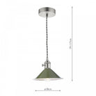Suspended by a twisted braided cable from a metal ceiling cup. The black twisted braided suspension cable can be adjusted during fitting so it hangs at the perfect height for you. This all-metal version has a vintage-look cone shade in an earthy olive green gloss finish and white inner, complemented by a sophisticated antique chrome ceiling rose and machined lamp holder.