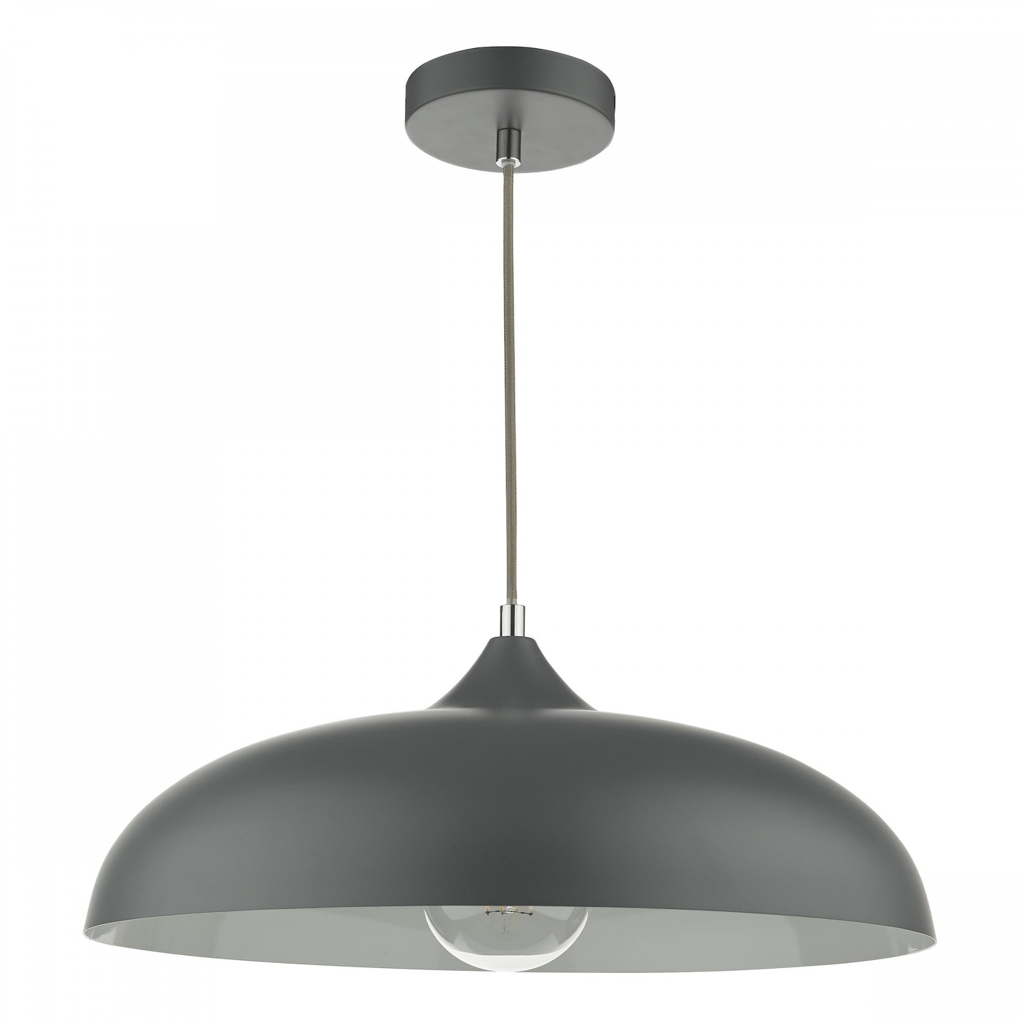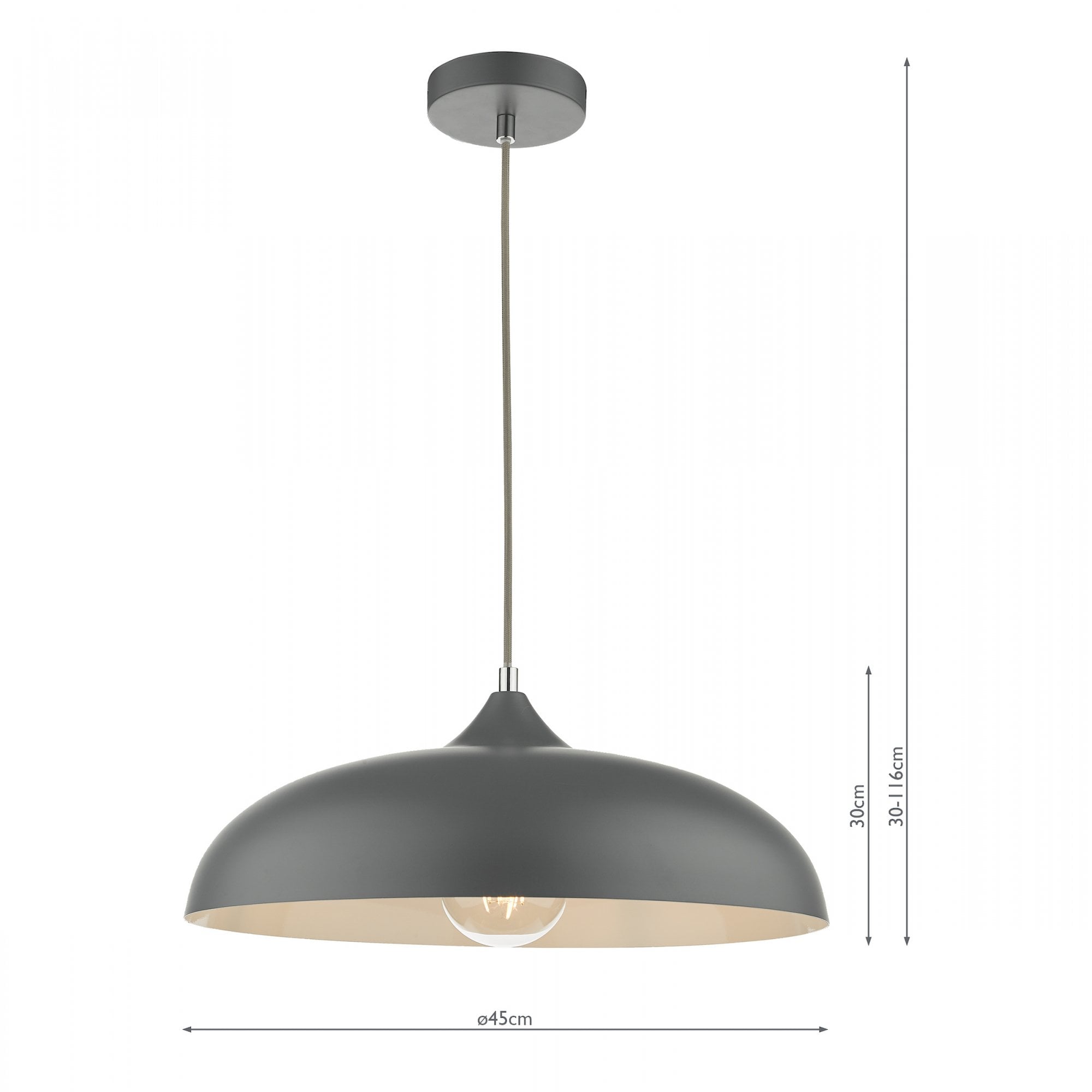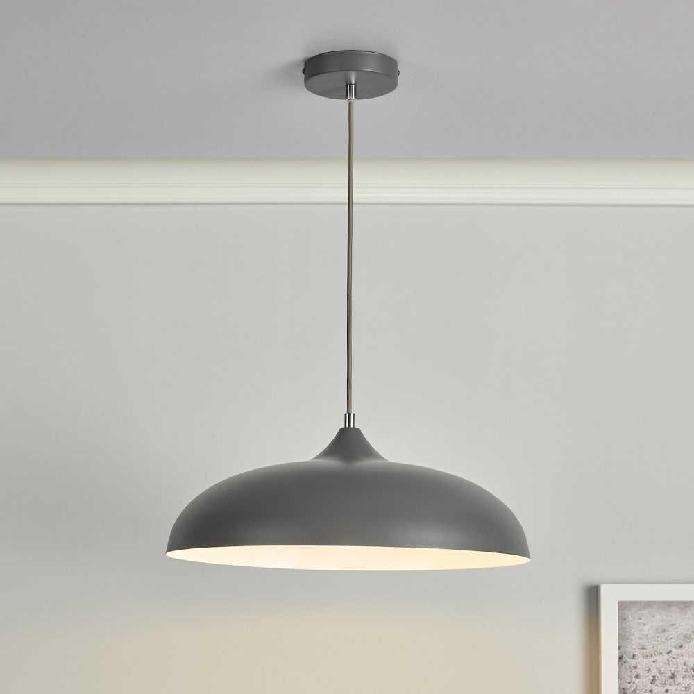 The Kaelan single pendant has a subtle and elegant curved dome finished in a modern matt mid-grey with small polished chrome details.