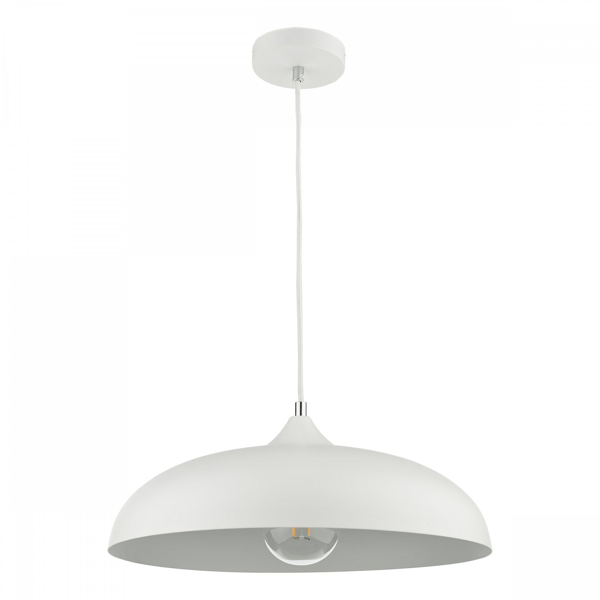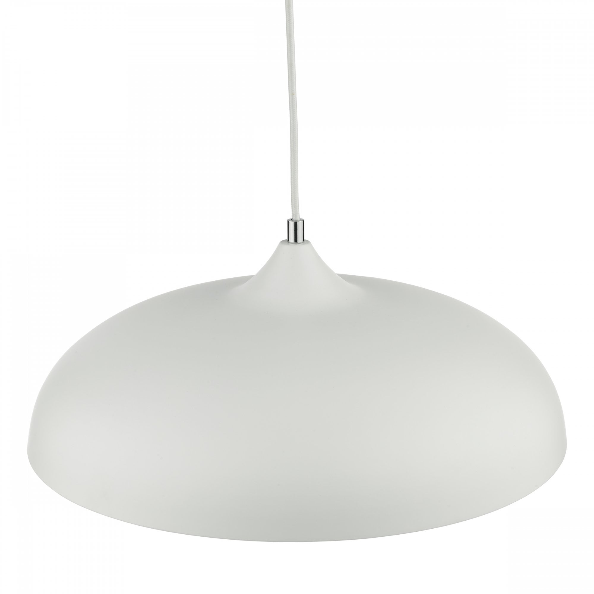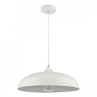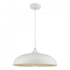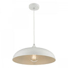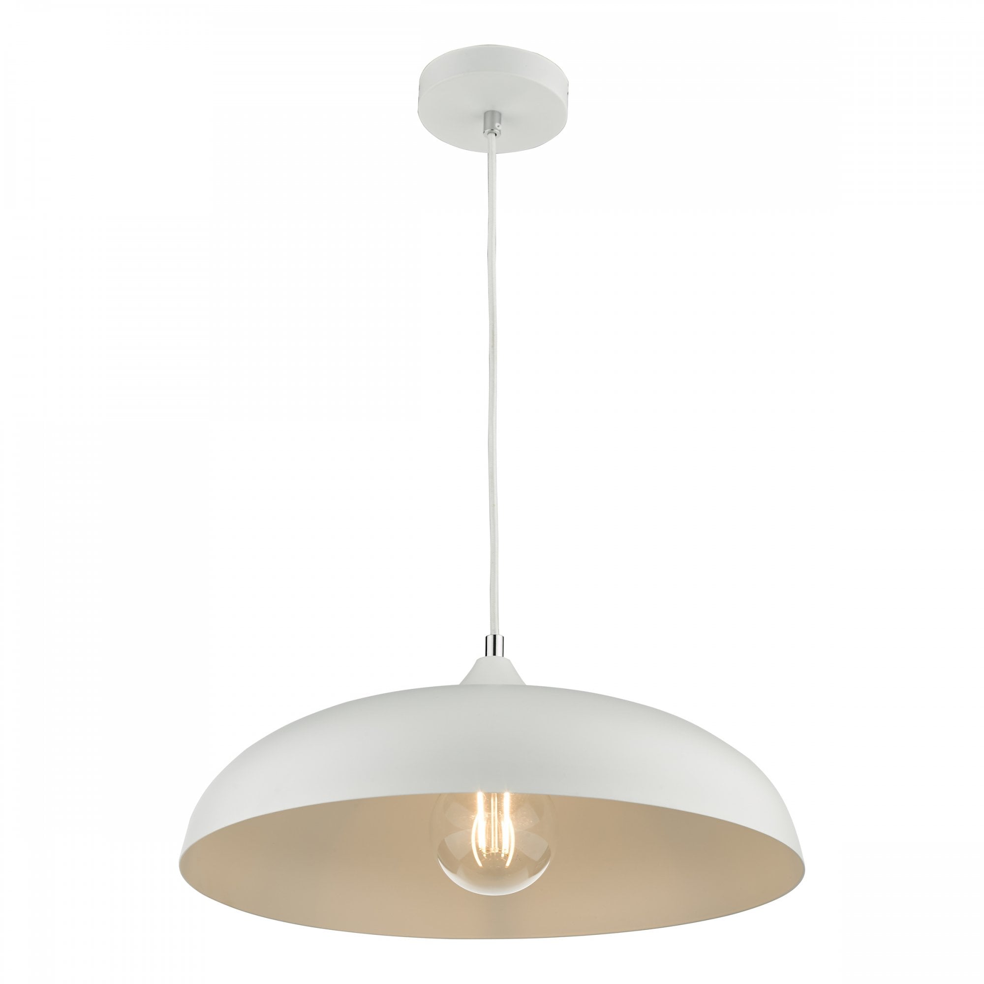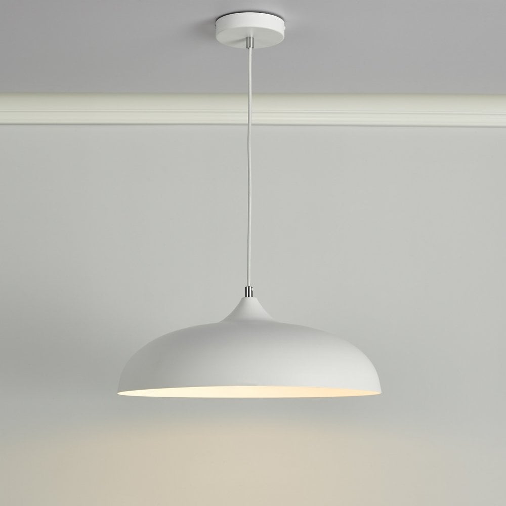 The Kaelan single pendant has a subtle and elegant curved dome finished in a chalky matt white with small polished chrome details.