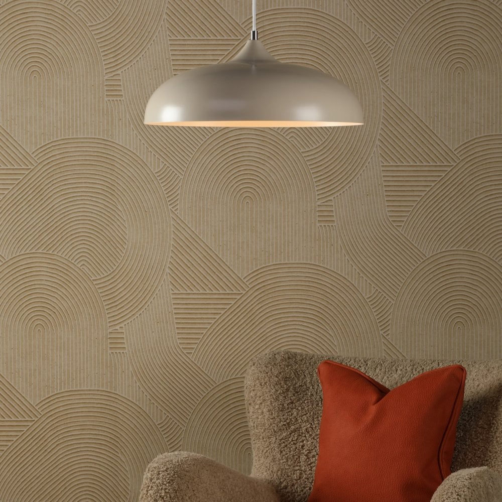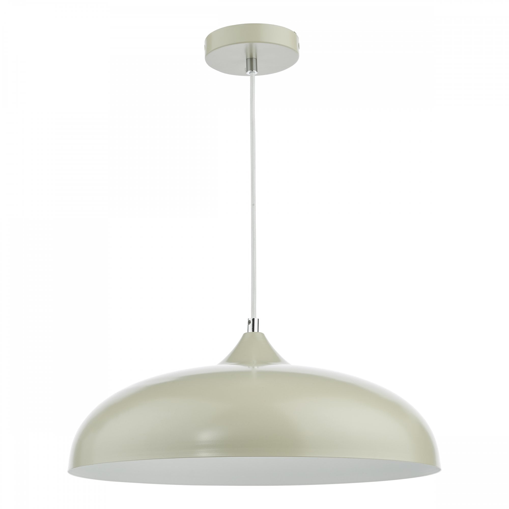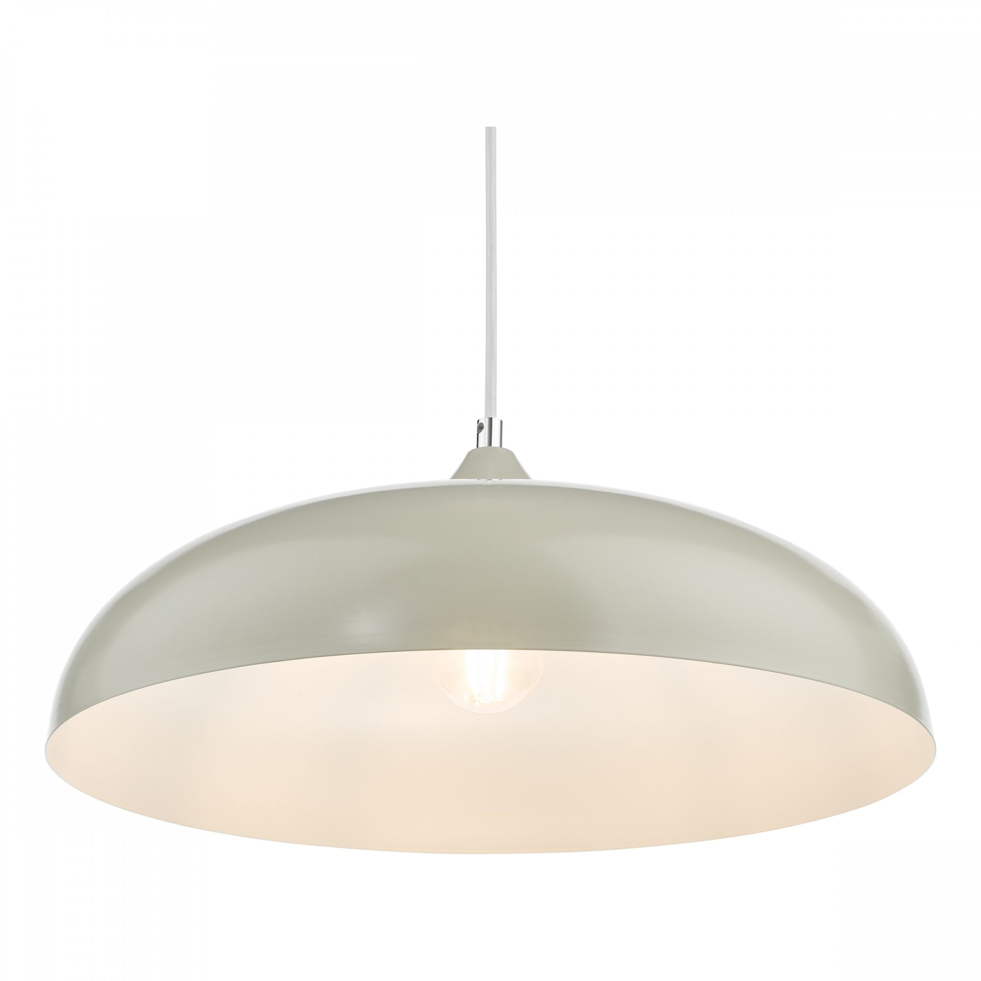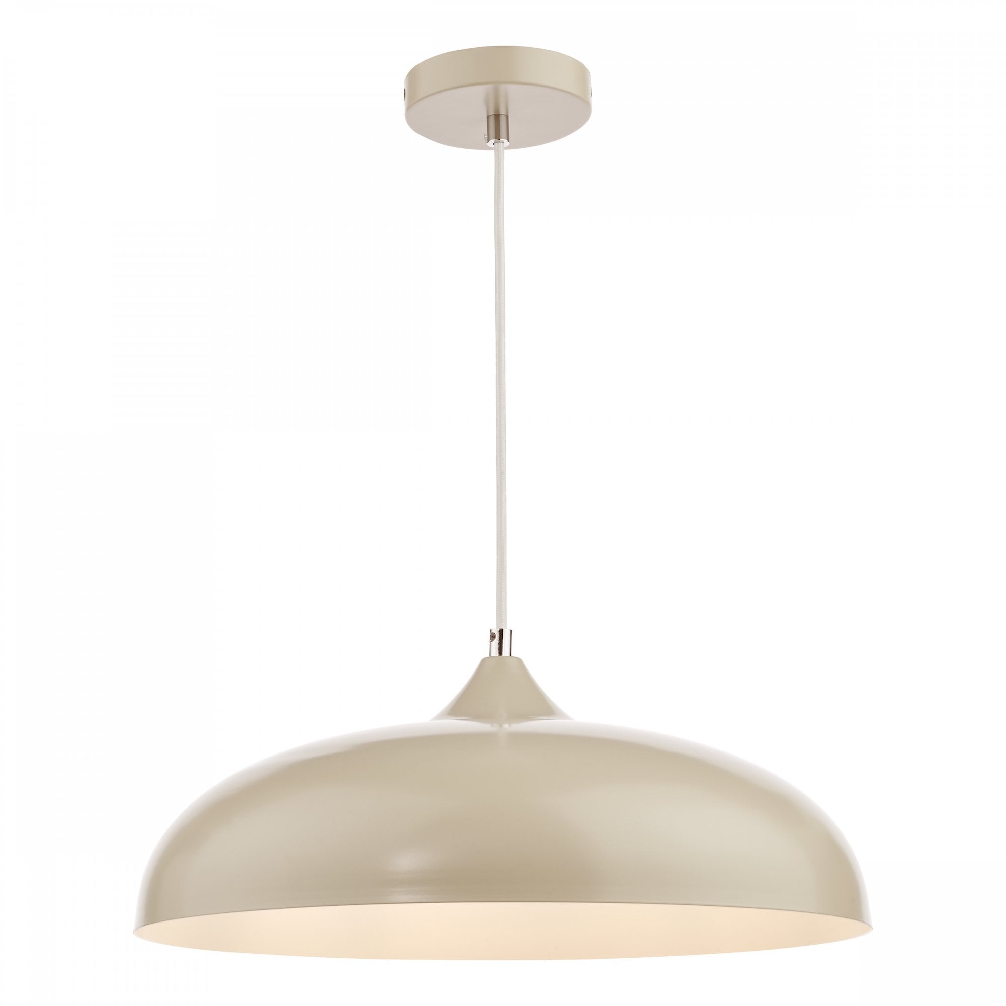 The Kaelan Pendant Taupe is a simple retro inspired metal pendant light with a taupe outer, white inner and a white braided cable. The Kaelan pendant features a simple yet stylish design that would look great in any room. The height is adjustable on installation, allowing you to set it at the perfect height.