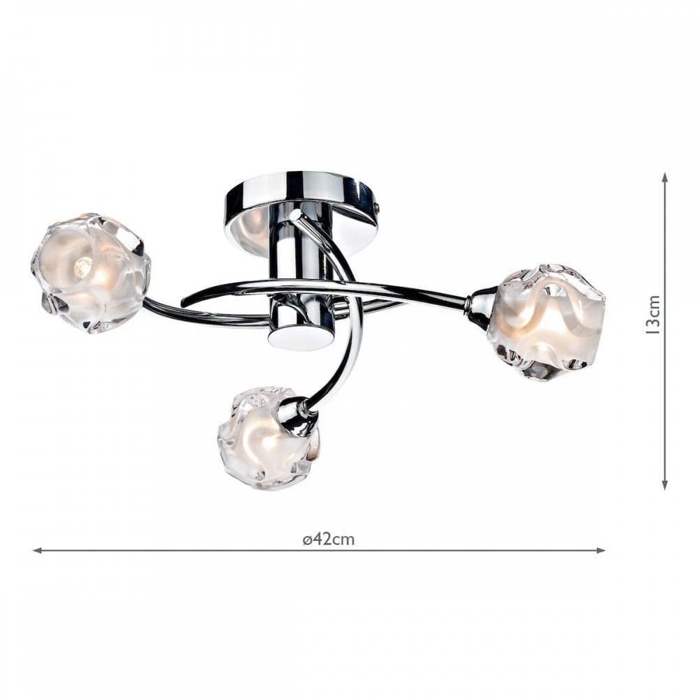 The SEATTLE 3lt Semi Flush has clear sculptured-glass shades with frosted inner detail and polished chrome frame.