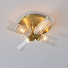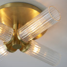 Four light semi-flush style; contrasting stunning satin brushed gold and clear ribbed glass come together in this elegant and timeless fitting.