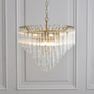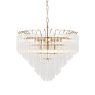 Show stopping tiered tubular glass chandelier with ribbed angled clear cylindrical glass set amongst satin brushed gold plated metalwork. A stunning focal piece to light up an interior space with grandeur.