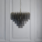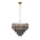 Show stopping tiered tubular glass ceiling pendant chandelier light with smooth smokey grey lustre cylindrical glass set amongst satin brushed gold plated metalwork. A stunning focal piece to light up an interior space with grandeur.